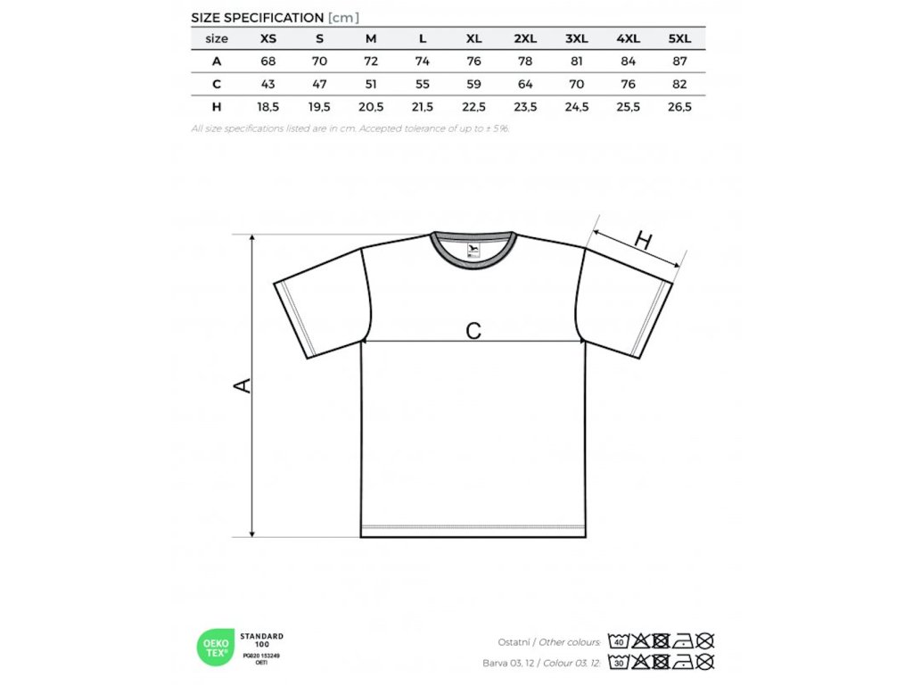 - Single Jersey, tubulární střih, úzký lem průkrčníku z žebrového úpletu 1:1 s 5 % elastanu, zpevňující páska od ramene k rameni, silikonová úprava